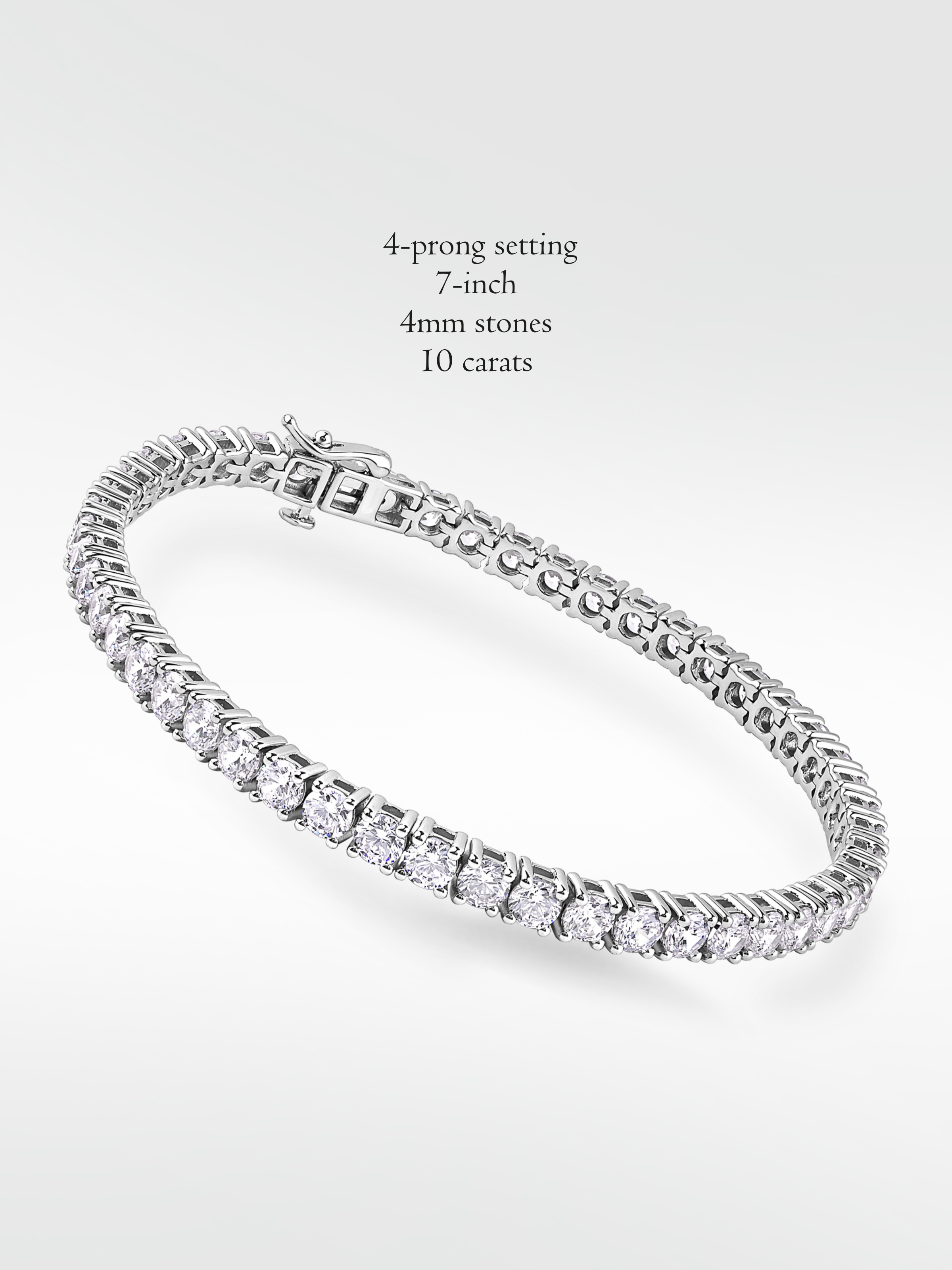 Our grand 4-prong diamond tennis bracelet showcases larger stones for statement sparkle, with ethically sourced diamonds and exceptional craftsmanship. Customize your diamond origin, stone size, length, and metal to create a bold bracelet that suits your style. Each piece is made to order, inspected by our artisans, and quality-checked before shipping. Carat weight is approximate; final weight and certificate are confirmed upon completion.